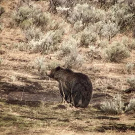 You can find these smaller dogs any time of year in Yellowstone. Coyotes are the most abundant and can be seen mousing in meadows in spring and summer, pouncing and wagging their tails. If you are real lucky you’ll get to see a den of fox or coyote pups – always in the spring – with little furballs wrestling and pouncing on each other. They can have up to 8 pups per den, and the adults take turns hunting for food to bring the hungry pups. Breeding happens in February and March and gestation is only two months.